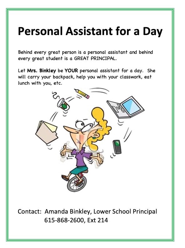 Mrs. Binkley will be your personal assistant for the day. She will help you with you carry your backpack, help you with your classwork, eat lunch with you, etc.