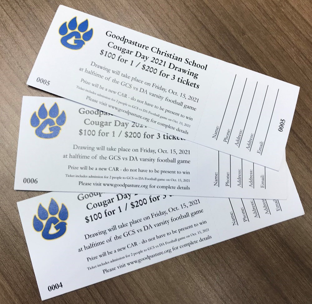 Cougar Day Tickets - 3 tickets for $250 Admission for two to the GCS vs. DA football game on October 15th per ticket, 3 entries for drawing of $1,000 tuition credit (must be present to win at the live auction on the 15th from 5:00 - 6:00 pm) You will also have 3 entries for the drawing of a new car at halftime of the football game (you do not have to be present to win) Bought Tickets can be picked up at schools administration office or at the live auction on Friday the 15th.