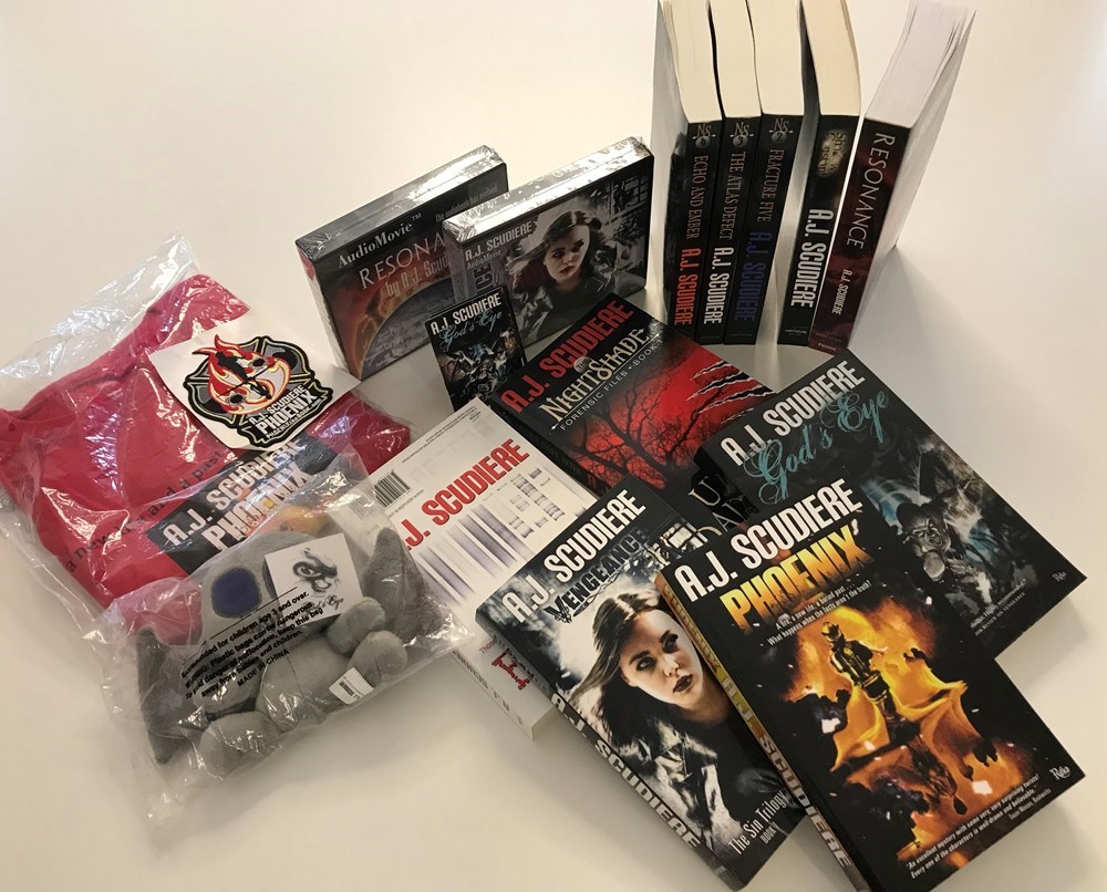 A.J. Scudiere Book Collection, Trading Cards, T-shirt, Patch, Stuffed Animal