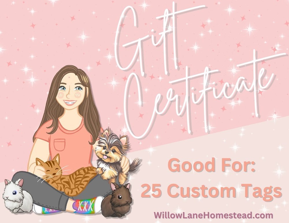 Gift Certificate for 25 custom cage tags Willowlanehomestead.com