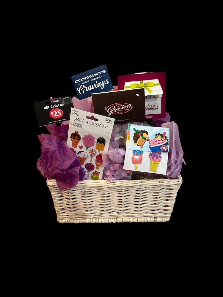 This basket includes: 1 - $25 Graeter's gift card 1 - $25 UDF gift card 1 - $25 Culver's gift card 1 - $25 Menchie's gift card 1 - $20 Dairy Queen gift card 1 - Set of 6 Ice Cream Bowls and Spoons 1 - Ice Cream Scoop 1 - Box of Ice Cream Cones 3 - Jars of Ice Cream Toppings