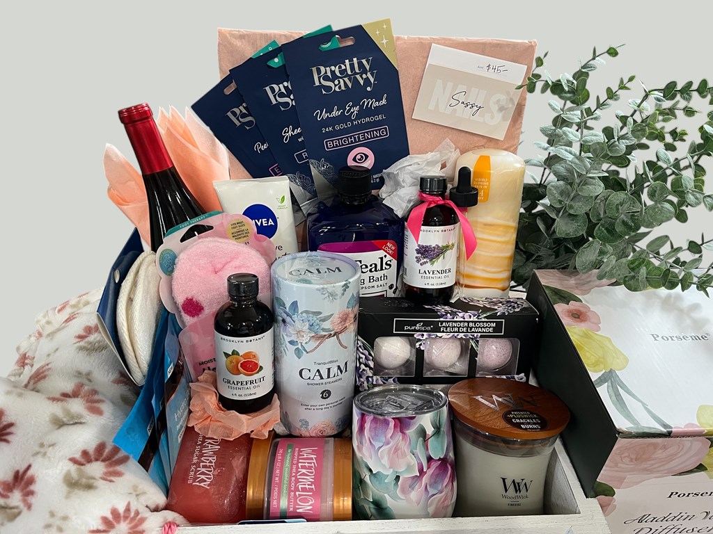 This basket includes: Essential Oil Diffuser Lavender and Grapefruit Essential Oils Microplush Throw Blanket $45 Sassy Nail Gift Card Pinot Noir Wine Reusable Wine Tumbler WoodWick Candle Aloe Infused Moisturizing Socks Bath Bombs Shower Steamers Dr. Teal’s Foaming Bath Sugar Scrub & Shea Body Butter Shower Poof & Exfoliating Loofa Olay Moisturizing Body Wash Nivea Face & Body Cream 3 Neutrogena HydroBoost Masks Face, Under Eye, & Peel-Off Masks Wooden Crate