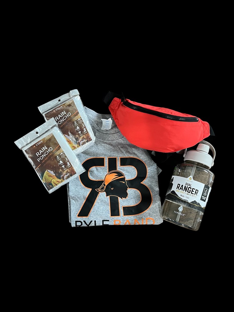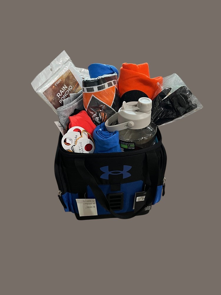 This basket contains: 1 - Adult Medium RB Glitter Crewneck Sweatshirt 1 - Adult XL RB T-Shirt 1 - Under Armour Cooler Bag 1 - 50 oz Water Bottle 1 - Orange Belt Bag 1 - Ryle Raider Scarf 1 - Youth Medium Space Between T-shirt 1 - Youth Large Space Between T-shirt 3 - Black and orange Pura Vida bracelets 1 - Pair Black Gloves 2 - Rain Ponchos 1 - Small RB Sticker