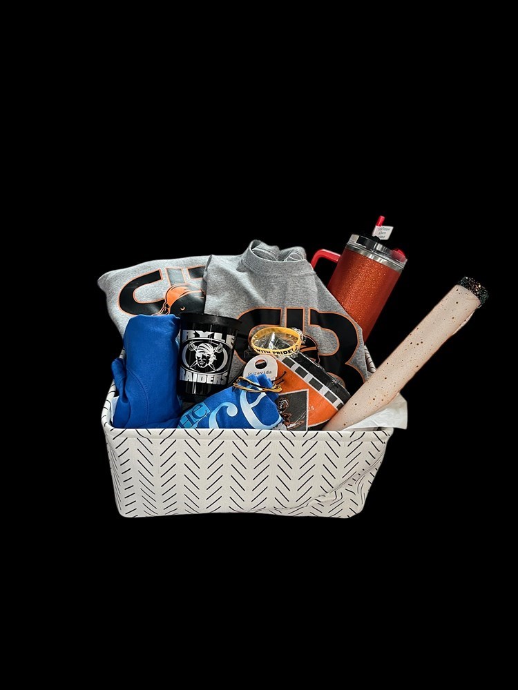 This basket includes: 1 - Adult Small RB Hoodie 1 - Adult Large RB T-Shirt 1 - Adult Medium Space Between T-Shirt 1 - Ryle Raiders Scarf 1 - RB Spirit Stick 1 - Ryle Cup 2 - Pura Vida Bracelets 1 - Youth Medium Space Between T-Shirt 1 - Small RB Sticker