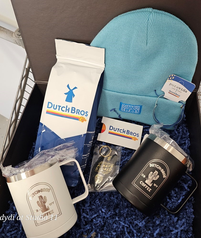 Get your morning going with this tasty package of Dutch Brothers coffee that you can make at home. Take it along with you in insulated travel mugs. If the weather is cold, a Dutch Brothers cap will keep you warm and comfortable.