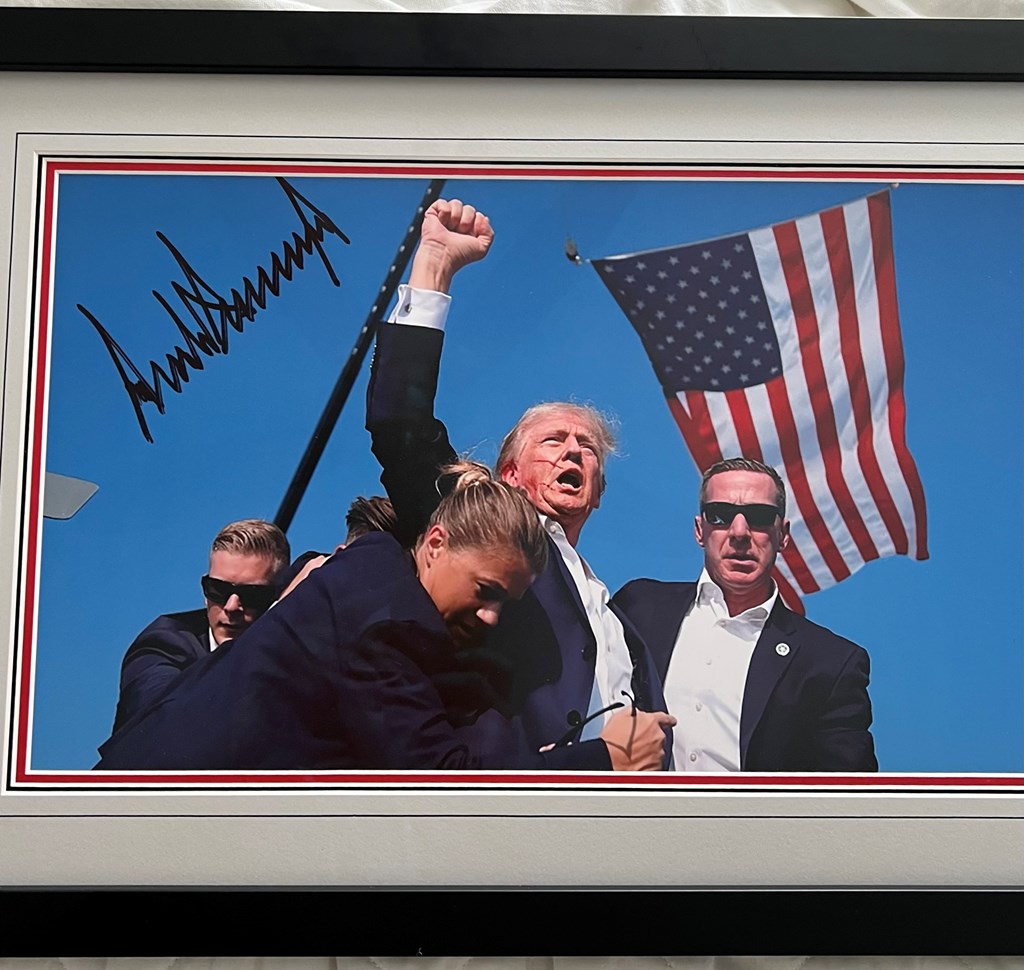 Original print of President Donald Trump's assassination attempt. Photograph is beautifully triple matted with a stunning black frame. President Trump has signed this photograph, making it a special and unique piece of memorabilia. Signed and framed photograph will be on display at the Floridian on April 27th.
