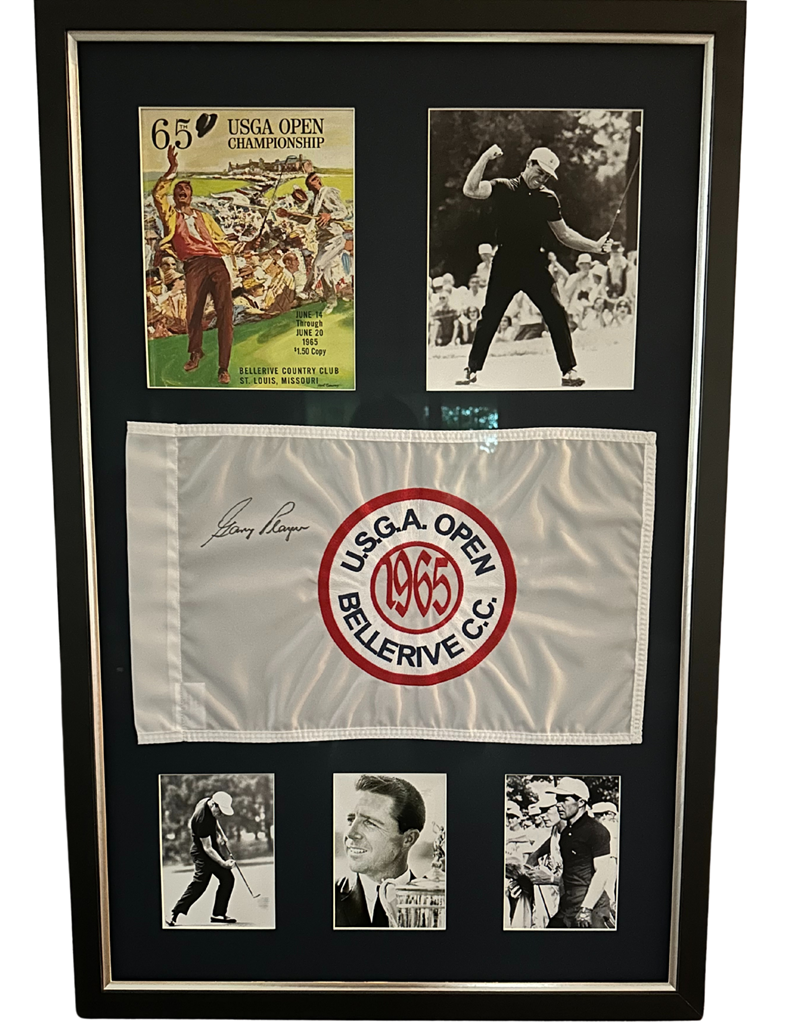 This US Open memorabilia piece includes a 1965 US Open flag signed by Gary Player and the program for the 1965 US Open, along with four images of Gary Player at the 1965 US Open. The signed program is removable from the back of the frame as well. This beautifully framed item is a piece of golf history! Overall size is