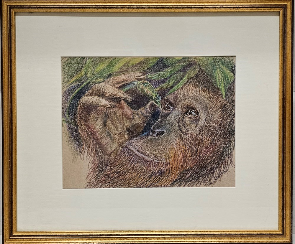 This delightful color pencil rendering is by popular artist, Deb Dahlin. She has managed to capture the expression of curiosity in the eyes. This nicely framed art piece measures 14 x 18.