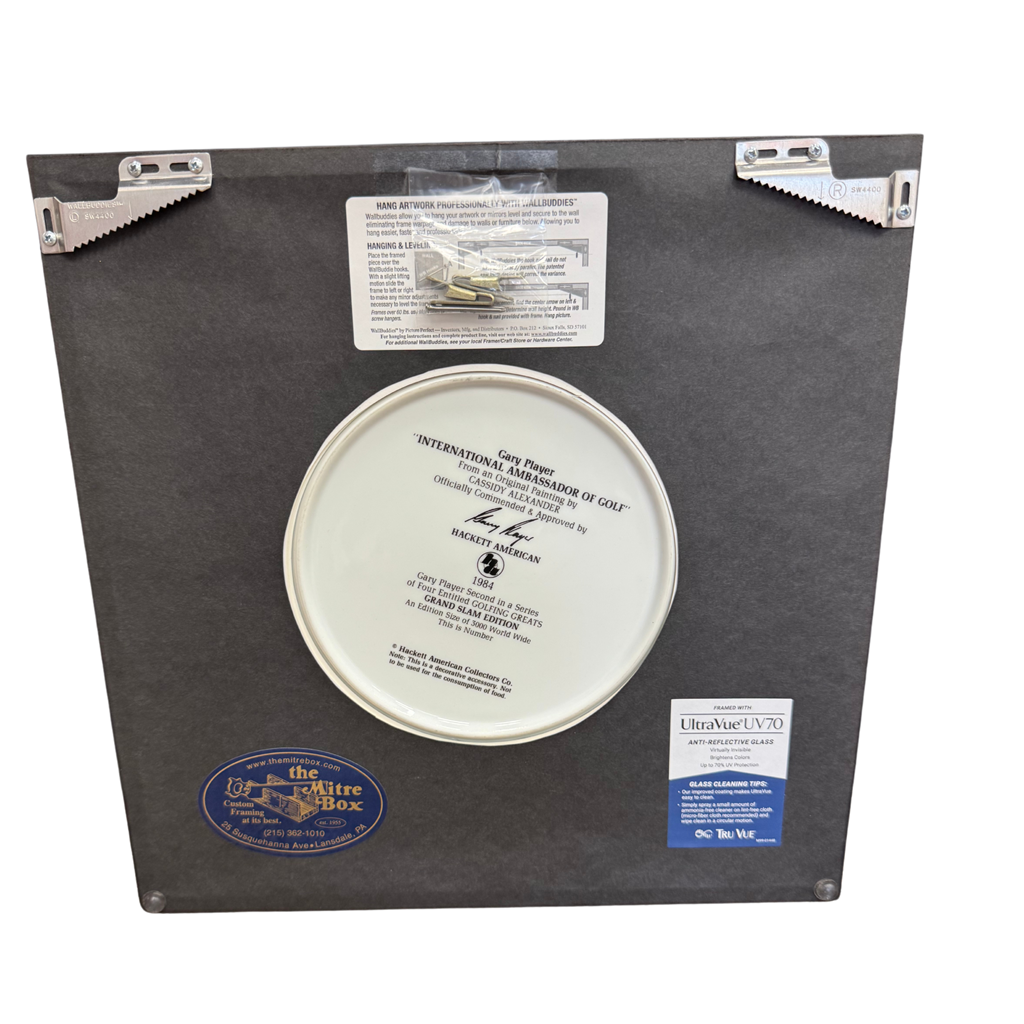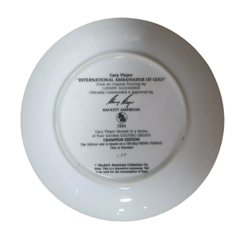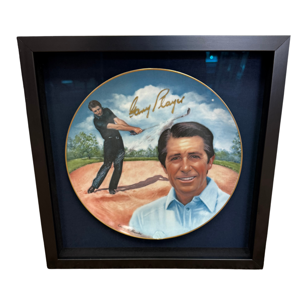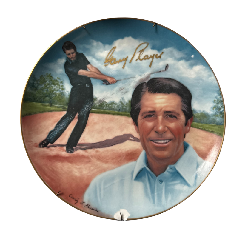 This 1984 Gary Player Hackett American collector plate is 10 1/4" diameter with a 24k gold band. It is titled "International Ambassador of Golf" as part of a set of four plates entitled "Golfing Greats: Champion Edition." The image is taken from an original painting by Cassidy Alexander, and is officially commended and approved by Gary Player. This collectible item comes framed and autographed in gold by Mr. Player, ready to hang or display.