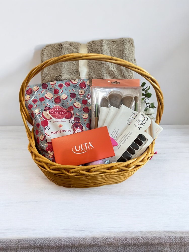 This basket includes: 1 - $25 Ulta Gift Card 1 - Fuzzy Throw Blanket 1 - Appleberry Scentsy Soak 4 - Color Street Nail Packs 1 - Set of Make-Up Brushes