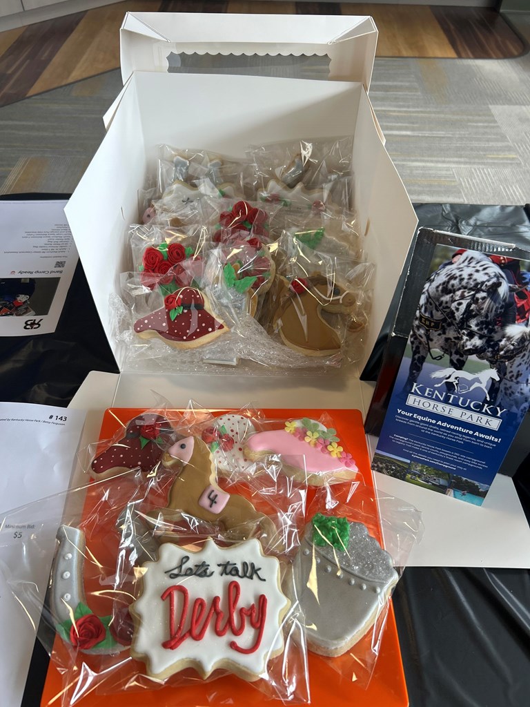 This basket includes: Family Four Pack Admission to Kentucky Horse Park (4 General Admissions) Six Kentucky Derby Mint Julep Glasses 2 Dozen Custom Derby-Themed Sugar Cookies* *Cookies were delivered fresh to the silent auction on May 1.