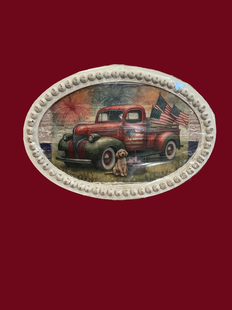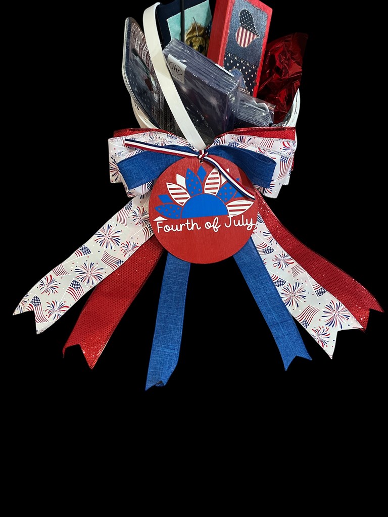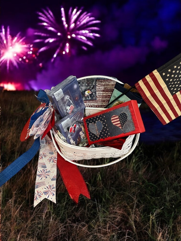 This basket contains: 1 - Kitchen Hand Towel 1 - Hand-crafted 4th of July Bow 1 - 8 count Paper Plates 1 - Hand-crafted 4th of July Wall Decor 1 - 16ct. Cocktail Napkins 1 - 20 ct. Cocktail Napkins 2 - Stanley Straw Covers 2 - 4th of July Hand-crafted Themed Blocks 1 - Flag
