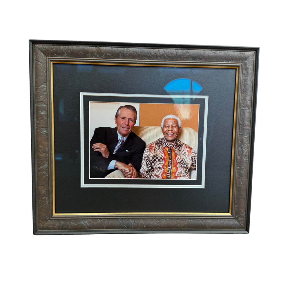 Nelson Mandela and Gary Player had a notable relationship, marked by mutual respect, admiration, and a connection forged through shared experiences within South Africa. Gary Player's admiration of Mandela and his actions in challenging international sanctions led to a strong friendship. Player even famously recounted kissing Mandela's feet upon their first meeting, a gesture reflecting his immense respect for Mandela. Mandela recognized the power of sport to unite people and inspire positive change, and he admired Player's achievements and influence. Player and Mandela were closely associated with the Nelson Mandela Invitational, a charitable golf tournament named in Mandela's honor. Mandela famously stated, "Sport has the power to change the world. It has the power to inspire. It has the power to unite people in a way that little else does," a quote that resonated with Player. This item comes with a beautifully framed photograph of Gary Player with Nelson Mandela signed by Gary Player. Also included are memorabilia items from Mandela's 100th Celebration. Signed photo will be on display at Gary Player's 90th Celebration on Sunday, April 27th.