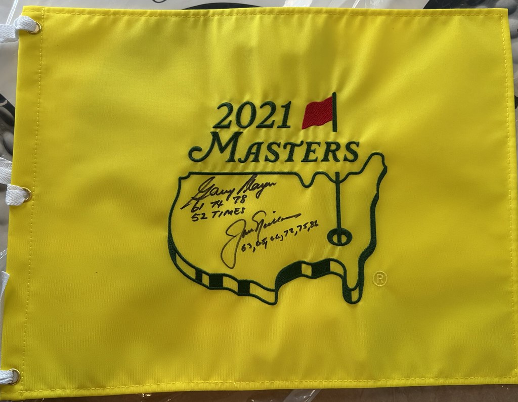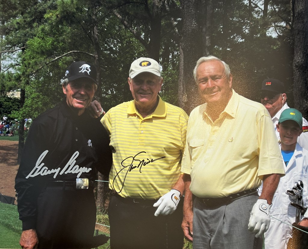 This item includes a framed photograph of the Big Three, signed by both Gary Player and Jack Nicklaus, along with a Masters Flag, also signed by Gary and Jack. Framed photograph will be on display at Gary Player's 90th Celebration on April 27th.