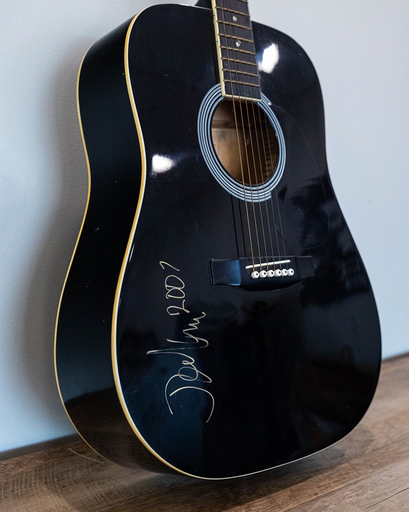 This black Johnson acoustic guitar is hand-signed by legendary musician John Mellencamp, making it a must-have for any music lover or collector. The autograph, dated 2007, is prominently displayed on the front of the guitar. A truly unique piece of memorabilia celebrating one of America’s most iconic rock and folk artists, perfect for display in a home, studio, or collection.