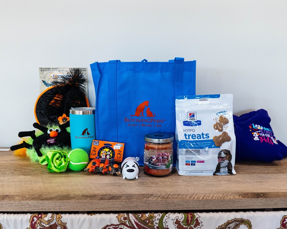 This festive tote from BloomingPaws – Clinic | Resort | Spa is packed with pet-friendly fun and a few treats for their humans, too. Inside you’ll find: - Hill’s Prescription Diet Hypo Treats for dogs - Halloween-themed dog toy and witch hat - Set of three plush cat toy mice - BloomingPaws stainless steel tumbler - Sugared Cranberry Pet Odor Exterminator candle - Dog-shaped waste bag dispenser - Custom BloomingPaws zip-up hoodie (S) - BloomingPaws reusable tote bag Perfect for spoiling your furry friend or gifting to a fellow pet lover. All items are new and unused.