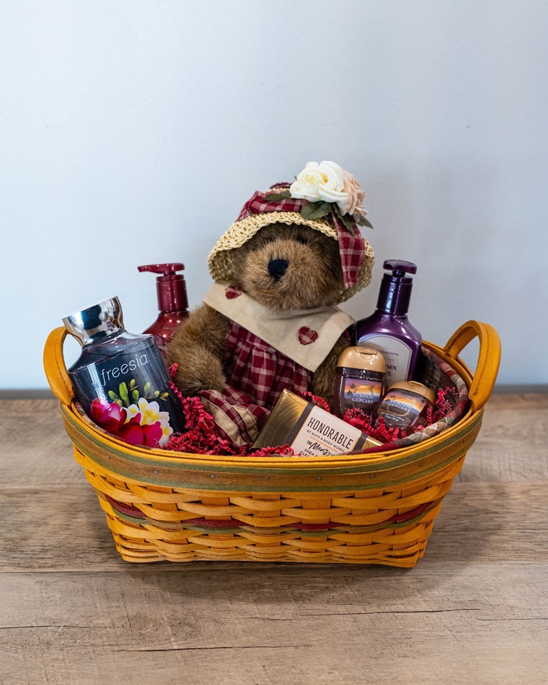 Celebrate the cozy scents of the season with this pampering and collectible gift basket. Perfect for self-care or gifting, it includes: 2 Shea Butter cleansing bar soaps 2 Pumpkin Cupcake anti-bacterial hand gels Frosted Cranberry shower gel Autumn Drive foaming hand soap Boyds Bear collectible A charming mix of personal care essentials and a collectible keepsake!