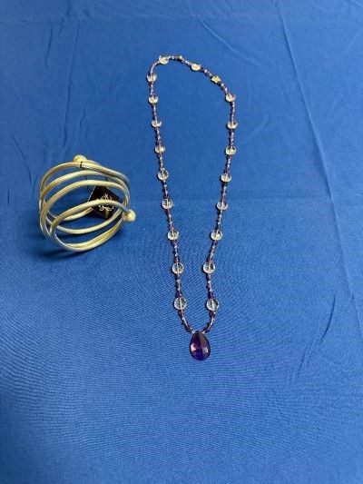 Donated handmade beaded Amethyst necklace by Linda Gaines (Daisy Does Beads) and beautiful unique bracelet donated by CBS