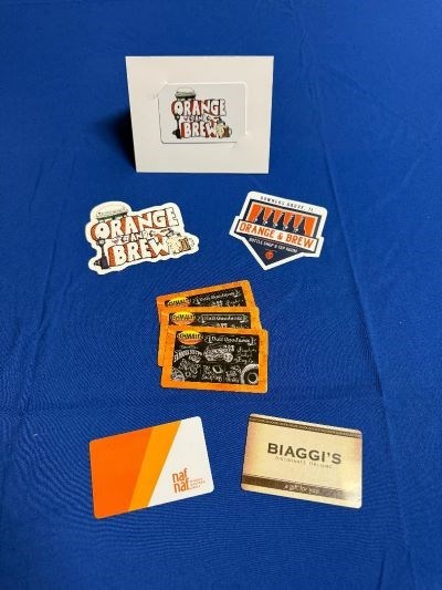 Multiple gift cards for a few fun nights out! $50 - Orange & Brew in Downers Grove $55 - Schmaltz in Lisle/Naperville $25 - Naf Naf $26 - Biaggis