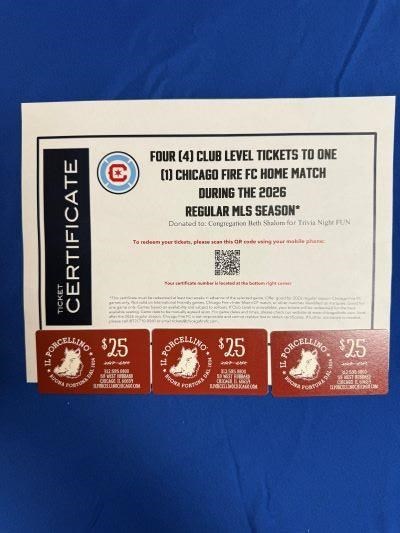 Four (4) Club Level Tickets to a Chicago Fire Home Match and $75 Gift Card to IL Porcellino in Chicago