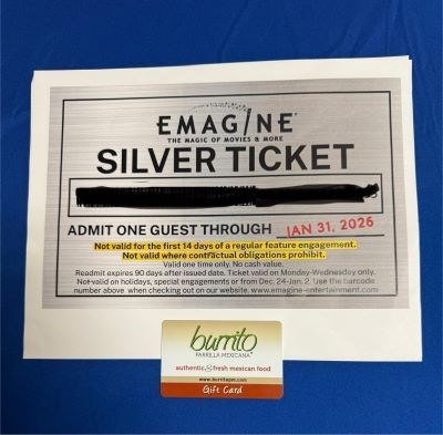 2 Tickets to Emagine Movie Theater and in Batavia/St. Charles and $25 Gift Card to Burrito Parrilla Mexicana